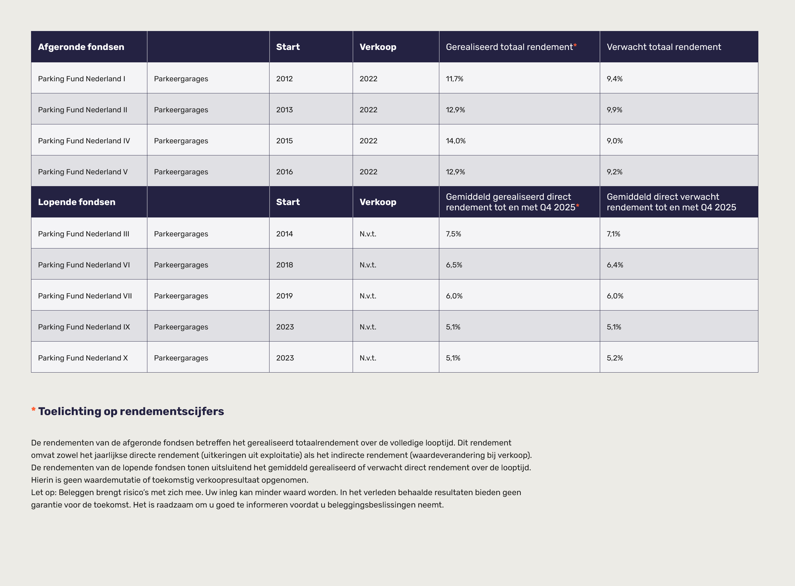De weergegeven rendementen geven inzicht in de historische prestaties van onze parkeerfondsen en de voortgang van de lopende fondsen. De resultaten illustreren de stabiliteit van parkeergaragevastgoed als beleggingscategorie binnen stedelijke infrastructuur. Tegelijkertijd geldt dat beleggen risico’s met zich meebrengt. In het verleden behaalde resultaten bieden geen garantie voor de toekomst. De waarde van een belegging kan fluctueren en het is mogelijk dat minder wordt terugontvangen dan is ingelegd.